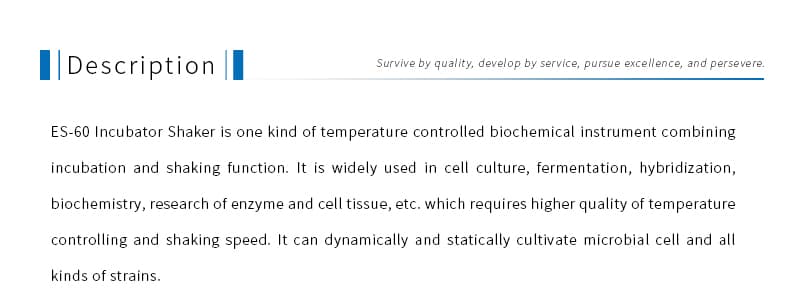 • Product description: ES-60 Incubator Shaker is one kind of temperature controlled biochemical instrument combining incubation and shaking function.