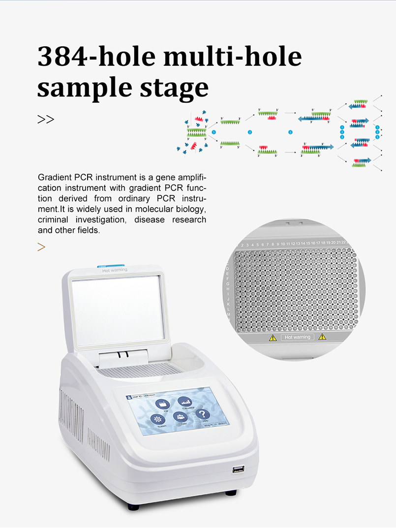 • Product description: Gradient PCR instrument is a gene amplification instrument with gradient PCR function derived from ordinary PCR instrument.It is widely used in molecular biology, criminal investigation, disease research and other fields.