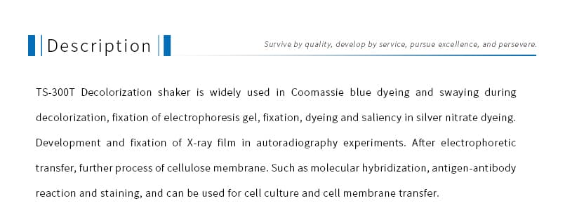 • Product description: TS-300T bleaching shaker is widely used in Coomassie blue dyeing and swaying during decolorization, fixation of electrophoresis gel, fixation, dyeing and saliency in silver nitrate dyeing.